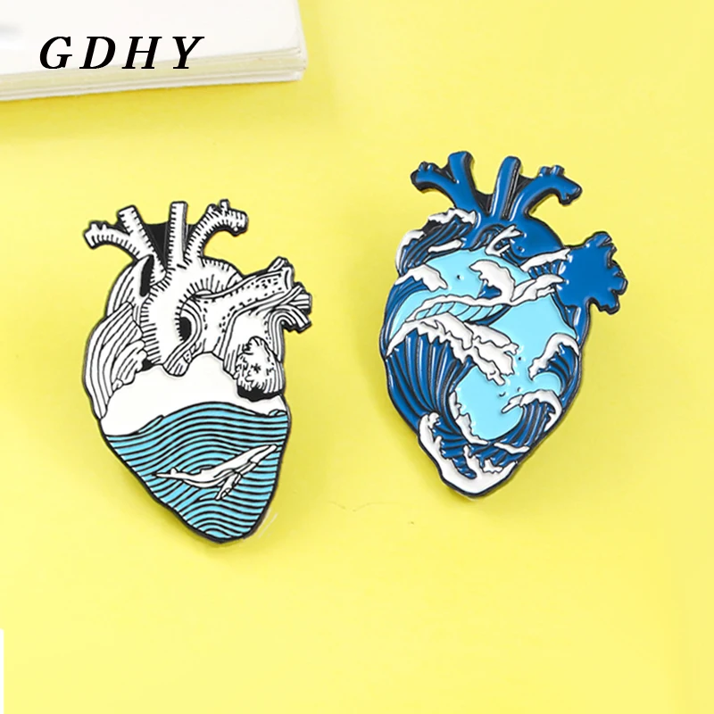 Offer GDHY Human Heart brooch Blue Ocean Sea Wave Whale namel Pins Lapel pins Anatomical Heart Badge Medi